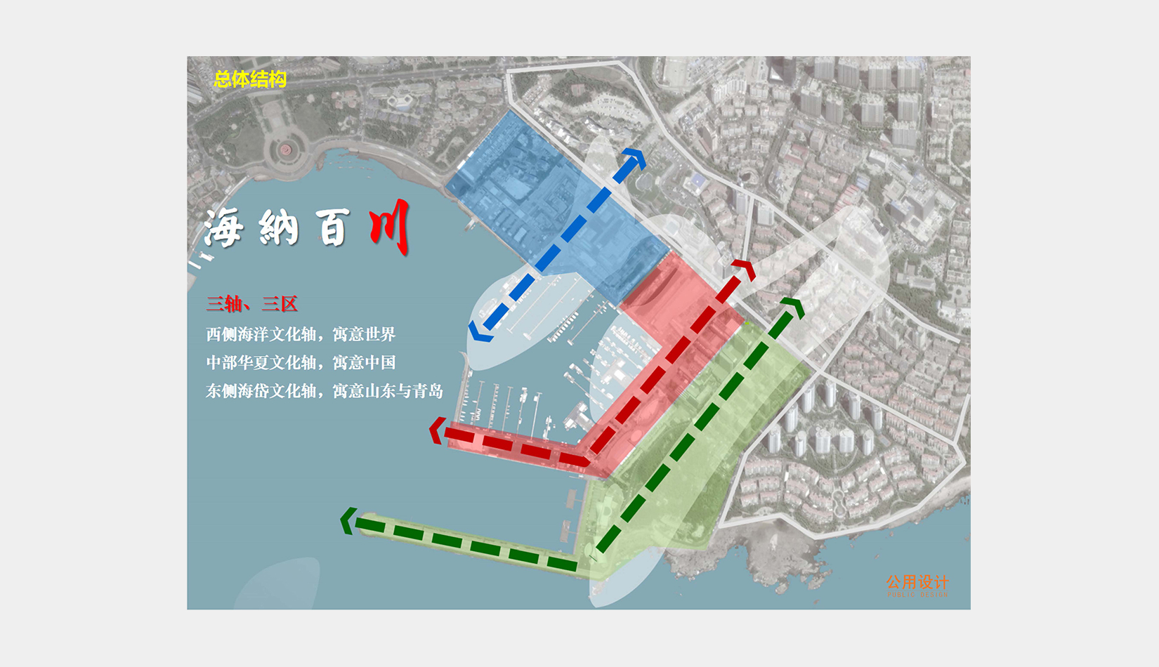 總體規(guī)劃以“青島與世界對(duì)話,合作與發(fā)展共贏”為核心理念,“海納百川、帆揚(yáng)世界”為主題定位,形成了三軸、三區(qū)的“川”字型整體規(guī)劃結(jié)構(gòu)。