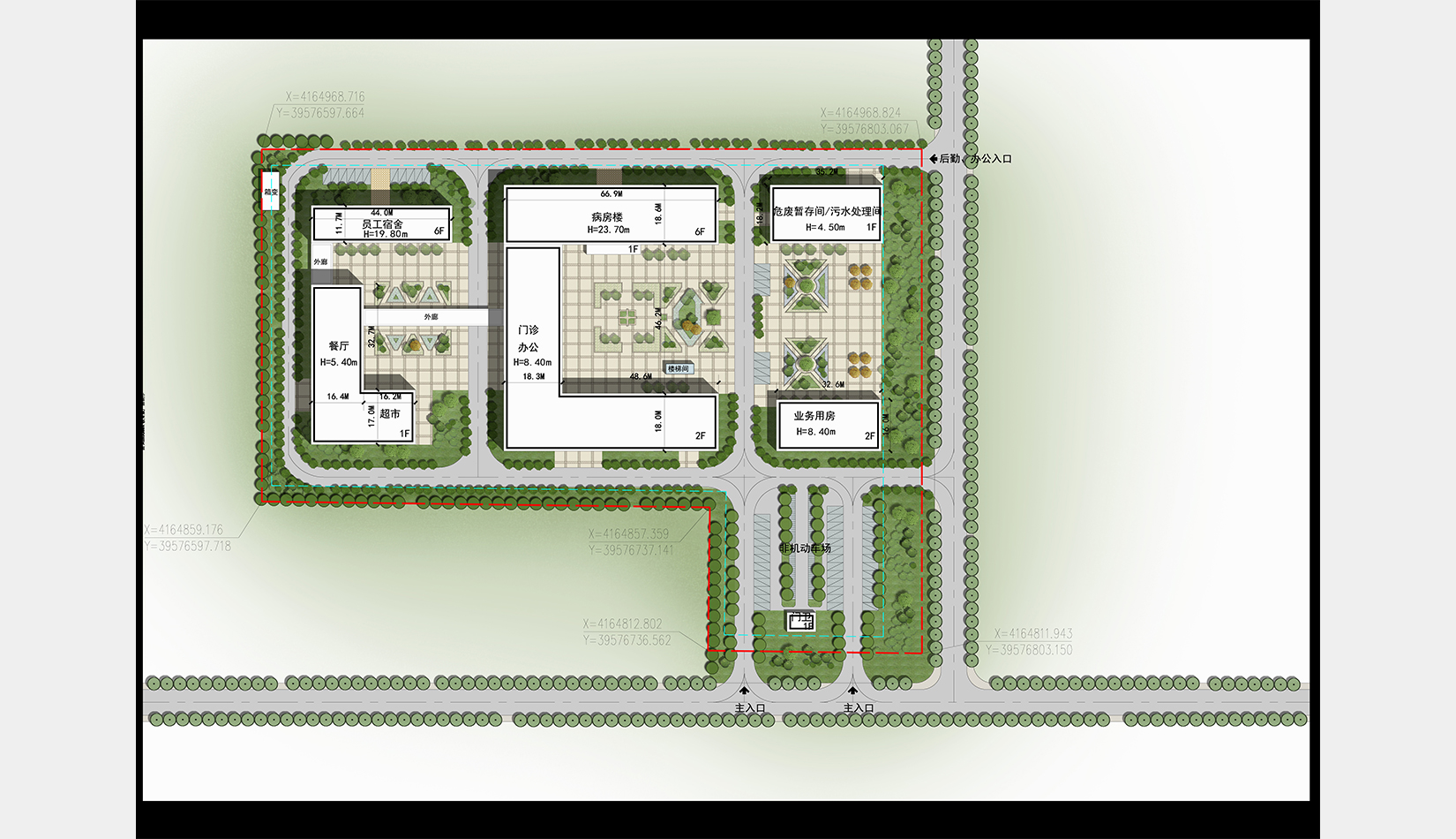 景觀設(shè)計(jì)采用圍合、穿插、滲透等設(shè)計(jì)手法,營造公園式景觀綠化,與建筑群體融合呼應(yīng),打造一個(gè)會呼吸多元化的綠色醫(yī)院,利用建筑之間的圍合關(guān)系,創(chuàng)造動態(tài)的具有生命力的局部景觀。