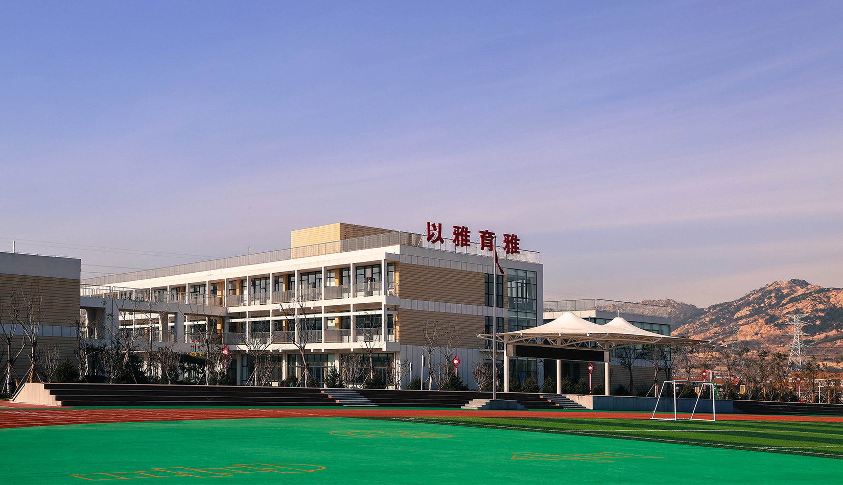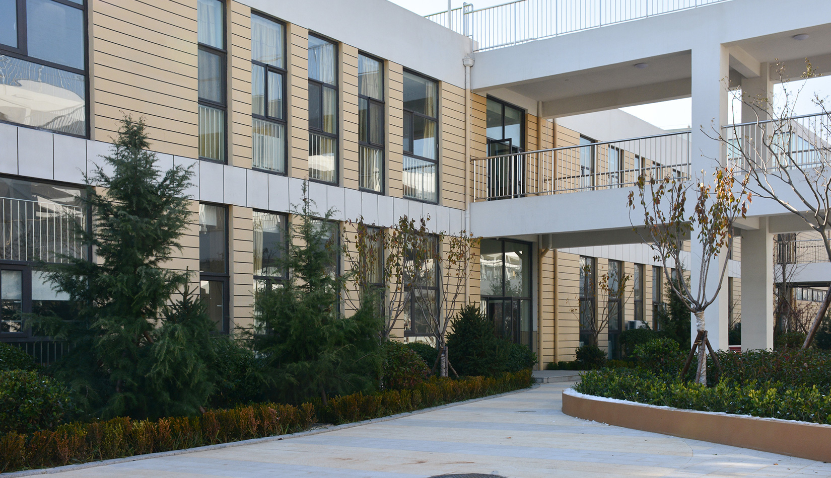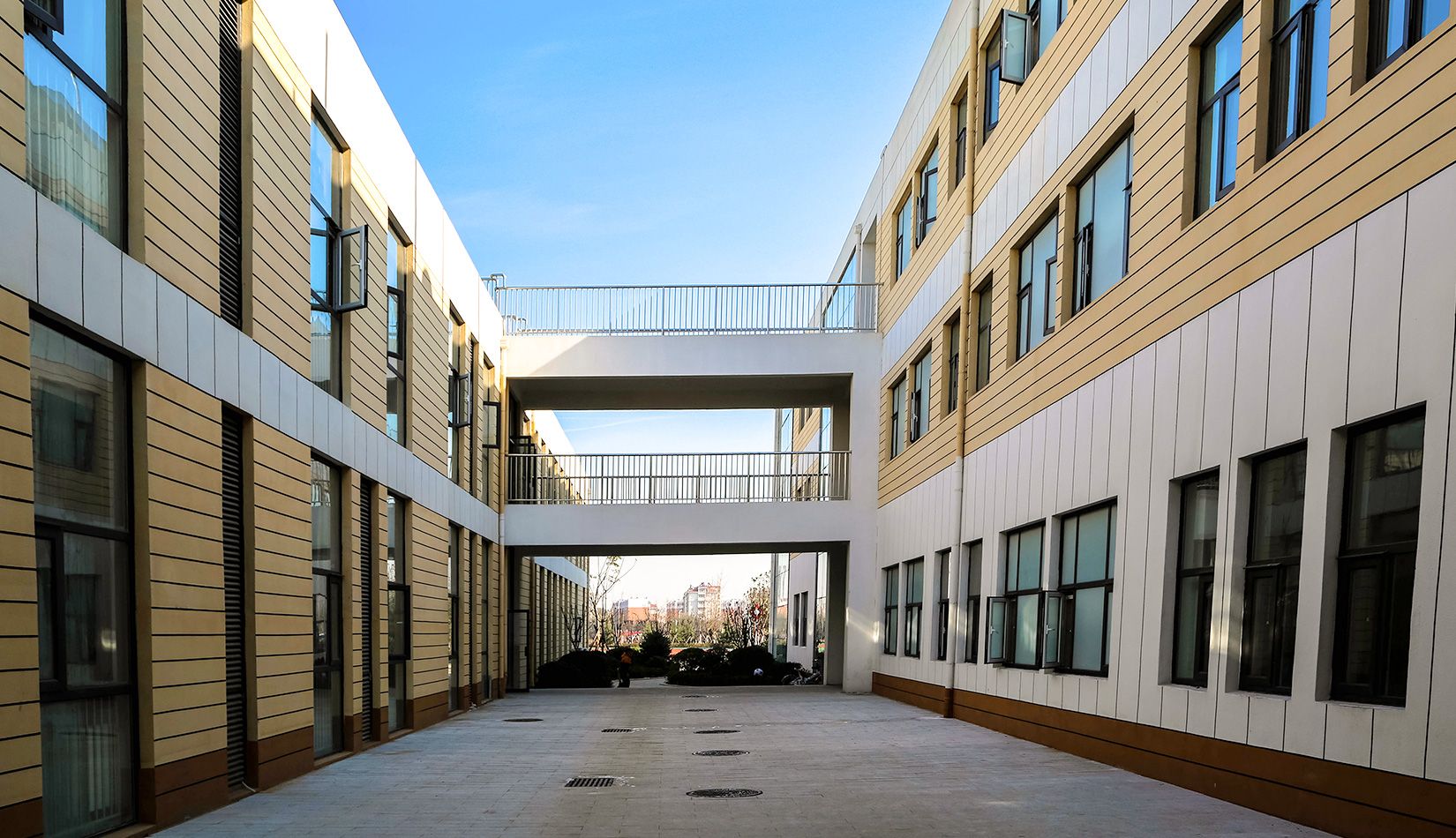 該項(xiàng)目通過幾個(gè)建筑單體與架空走廊的穿插連接將整個(gè)校區(qū)有機(jī)聯(lián)系起來,實(shí)現(xiàn)了建筑功能的整體性,完善了建筑可達(dá)性。形成的中庭空間可成為交流為主的平臺(tái),營造了學(xué)習(xí)、活動(dòng)為一體的校園氛圍。建筑外立面以簡潔的現(xiàn)代風(fēng)格為主,同時(shí)表現(xiàn)校園文化,主要采用黃色與白色真石漆形成色彩對(duì)比,在教室南立面、樓梯間、就餐區(qū)等采用整體通透的玻璃幕墻與實(shí)墻形成虛實(shí)對(duì)比,形成簡潔而不失活潑的建筑風(fēng)格。利用借景等手法進(jìn)行室外綠化設(shè)計(jì),整體打造一個(gè)高品質(zhì)的學(xué)校環(huán)境。