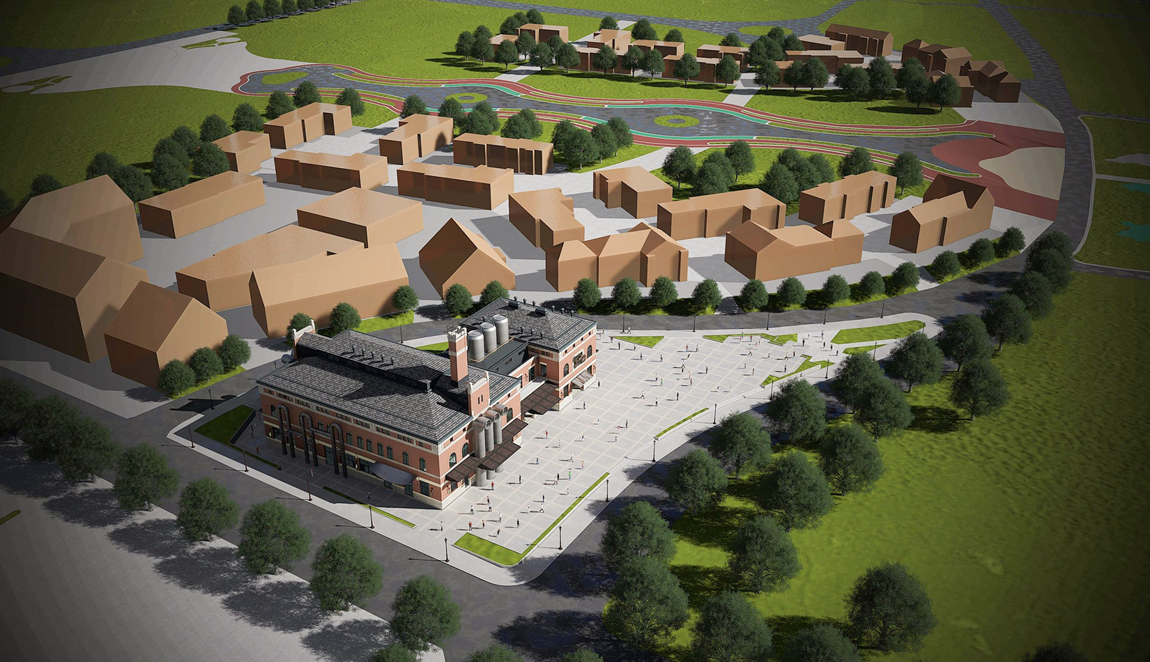 紅磚是工業(yè)風(fēng)的最佳表現(xiàn)元素之一,本案選取紅磚作為立面主要材質(zhì),加以真石漆、石材進(jìn)行點綴,磚塊與磚塊中的縫隙可以呈現(xiàn)有別于一般墻面的光影層次。屋面形式選取深灰色瓦屋面加以深色金屬板點綴,與立面形成強(qiáng)烈的視覺對比,旨在體現(xiàn)工業(yè)風(fēng)的粗獷氛圍。